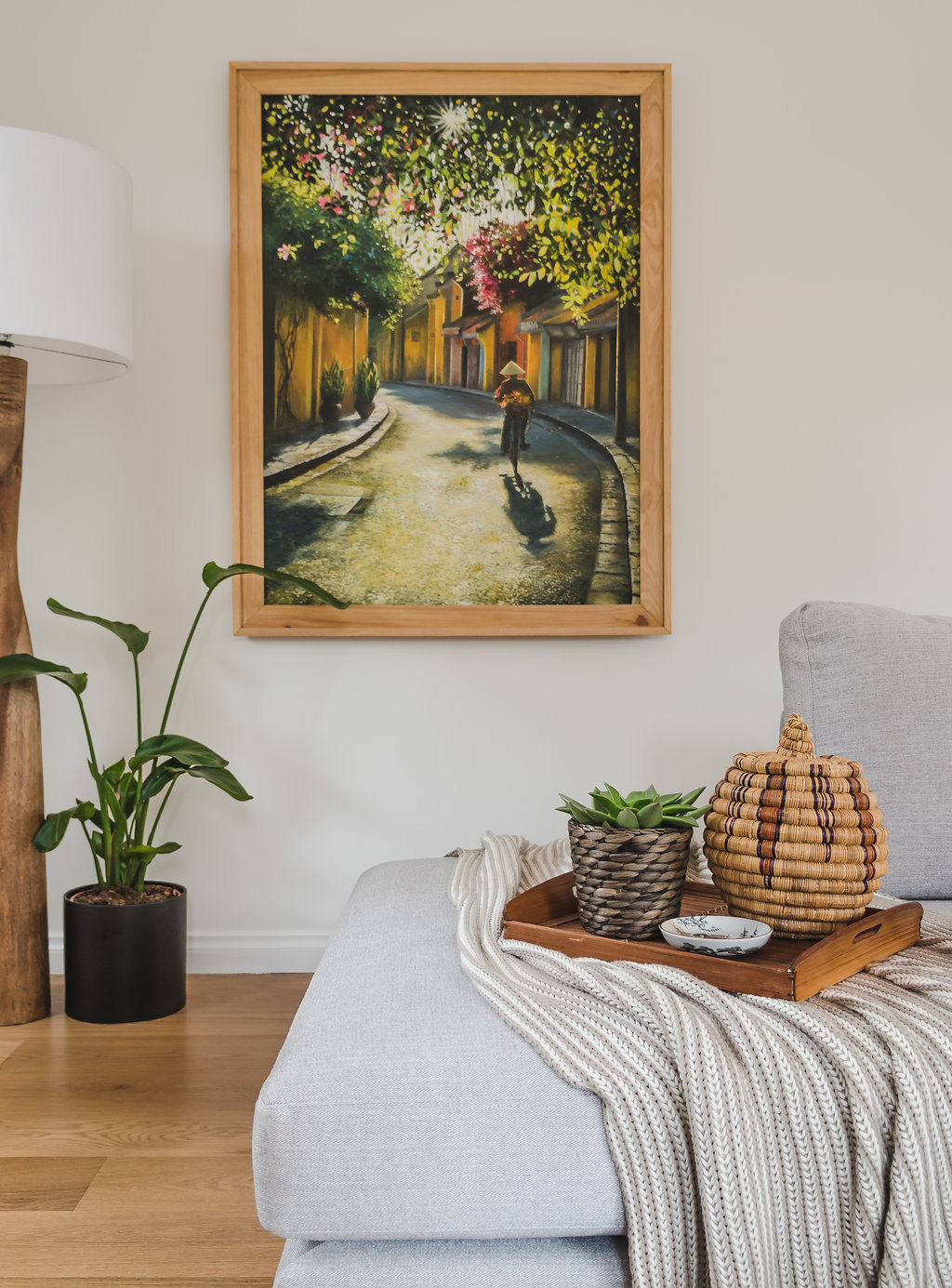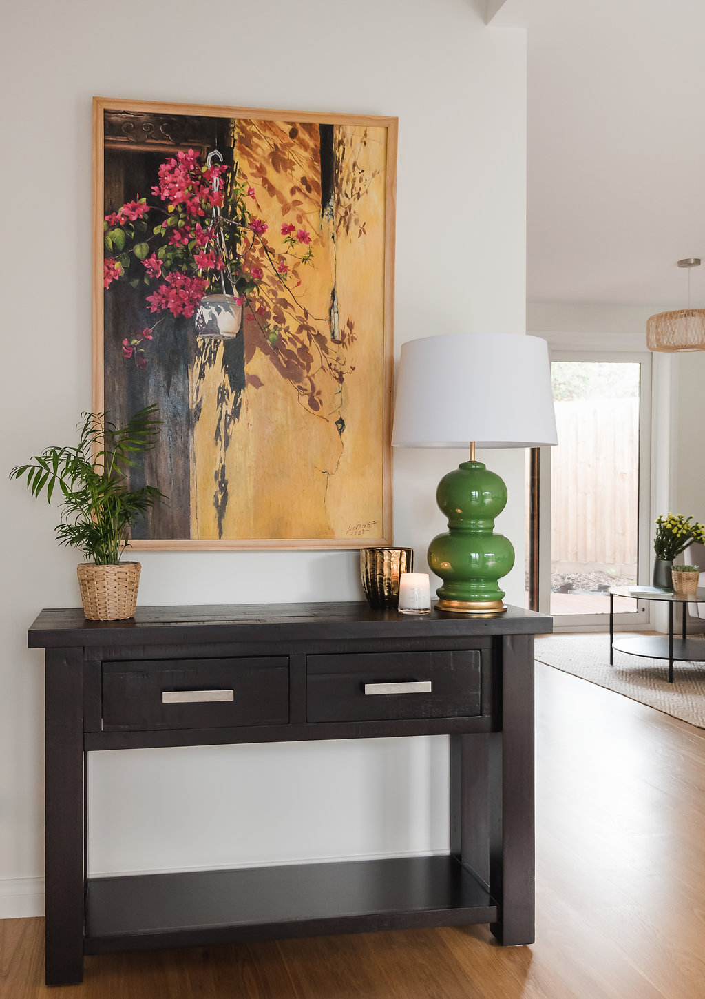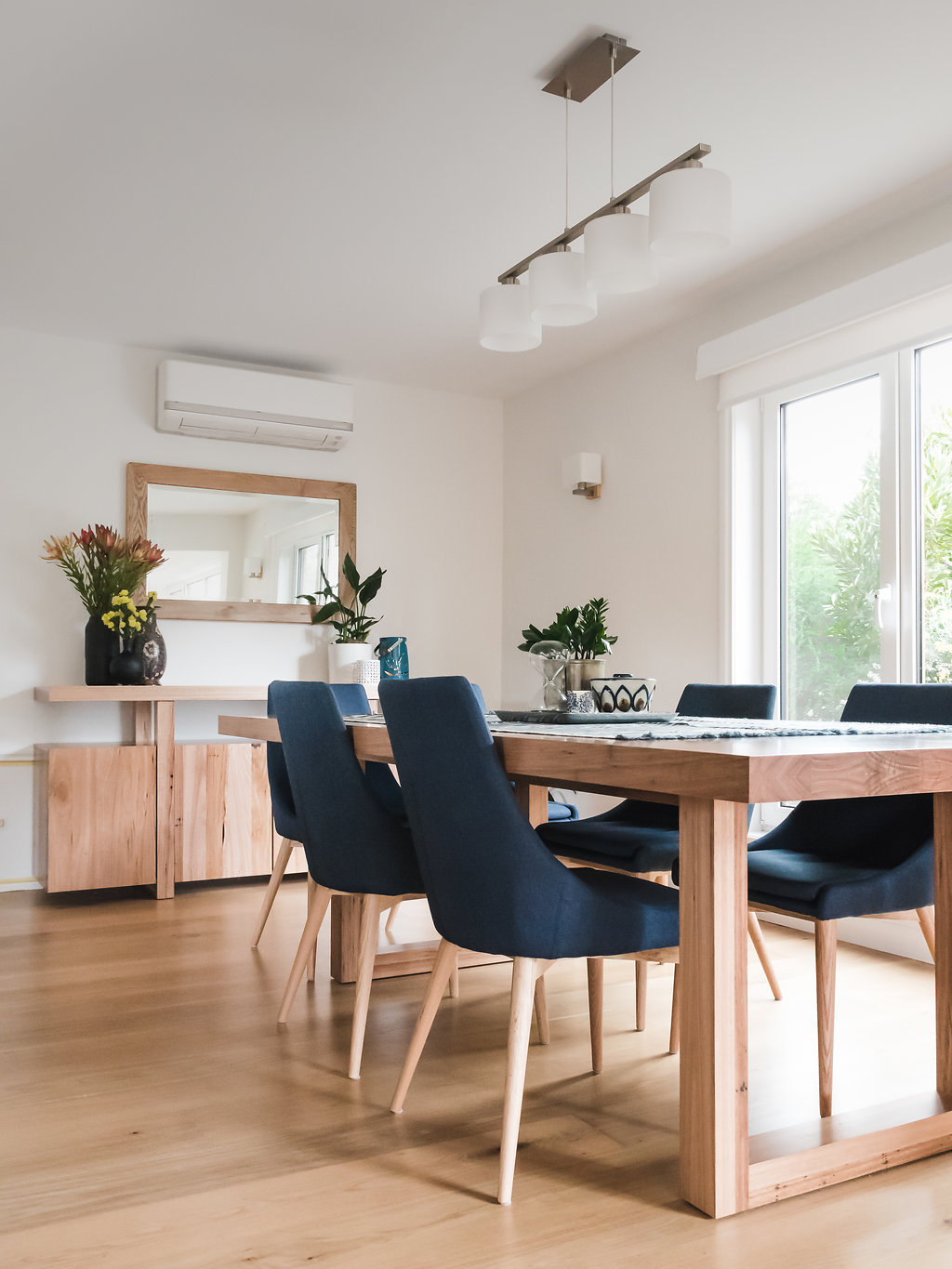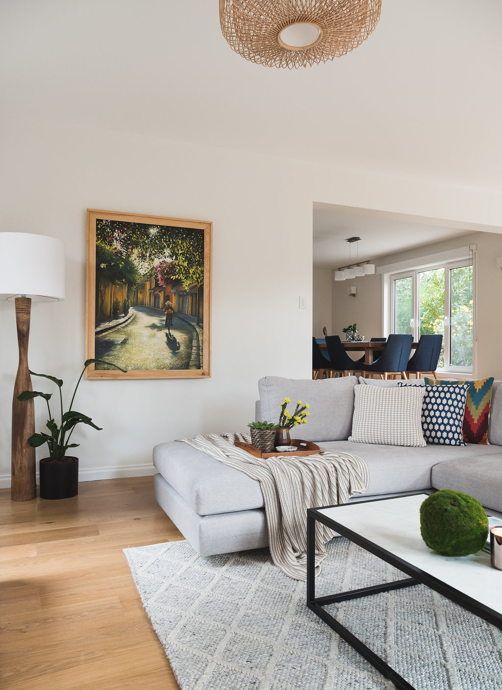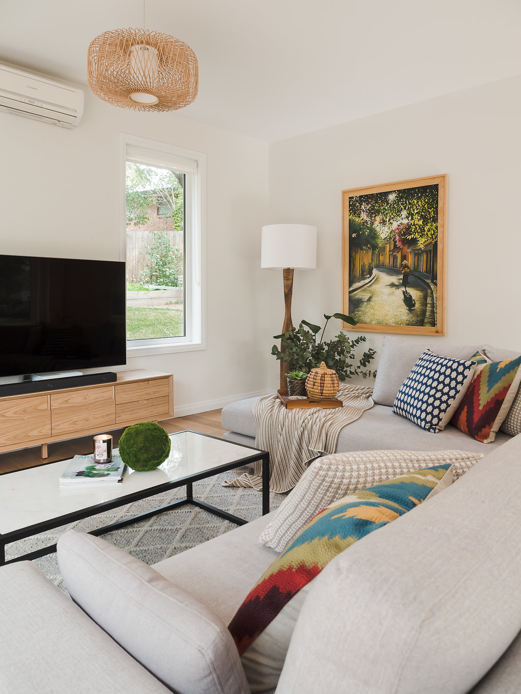 Once the building works were complete, my clients knew they had to engage me to furnish their home. A lot of the colours in their home were inspired by some artworks of scenes of their homeland, Vietnam. So with these artworks as a cue, I specified a custom sofa, rugs, cushions, lamps, table, chairs sideboards and other pieces of furniture to create this layered, textural and contemporary home