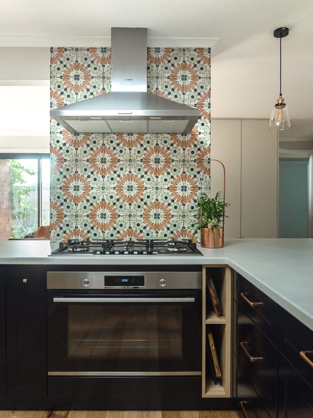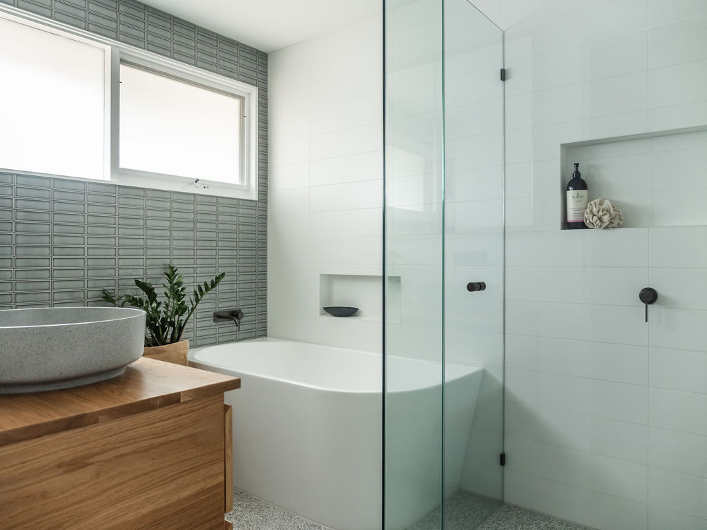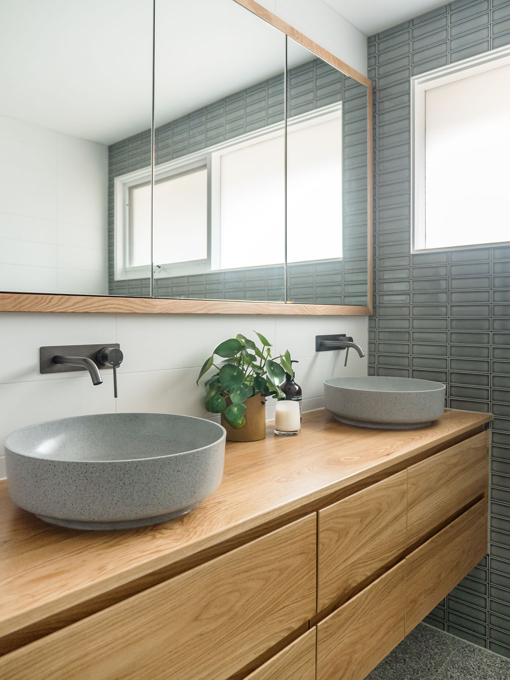 The bathroom is shared by their three boys, so it called for some moody blue tiles, gun metal tapware and timber vanity. Terrazzo style porcelain floor tiles were selected to bring in some pattern and provide a practical and serviceable choice of flooring in the bathroom and laundry.