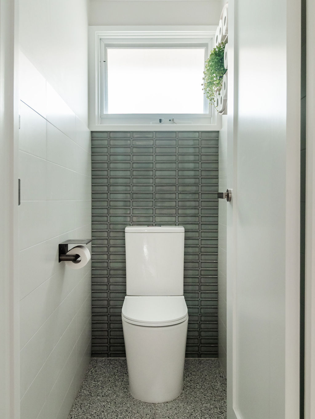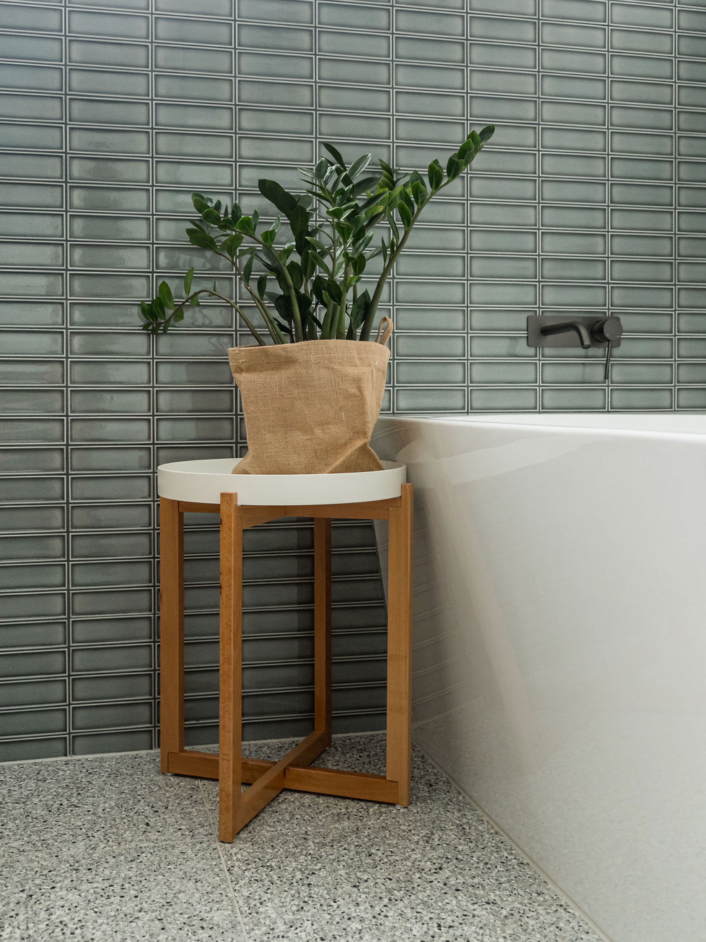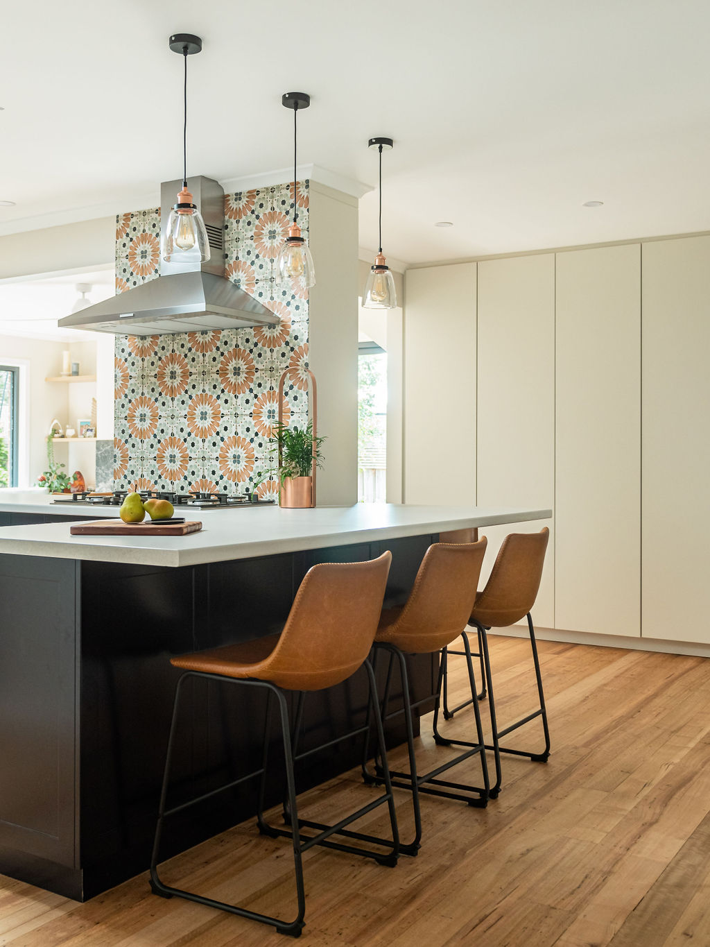 The bathroom is shared by their three boys, so it called for some moody blue tiles, gun metal tapware and timber vanity. Terrazzo style porcelain floor tiles were selected to bring in some pattern and provide a practical and serviceable choice of flooring in the bathroom and laundry.