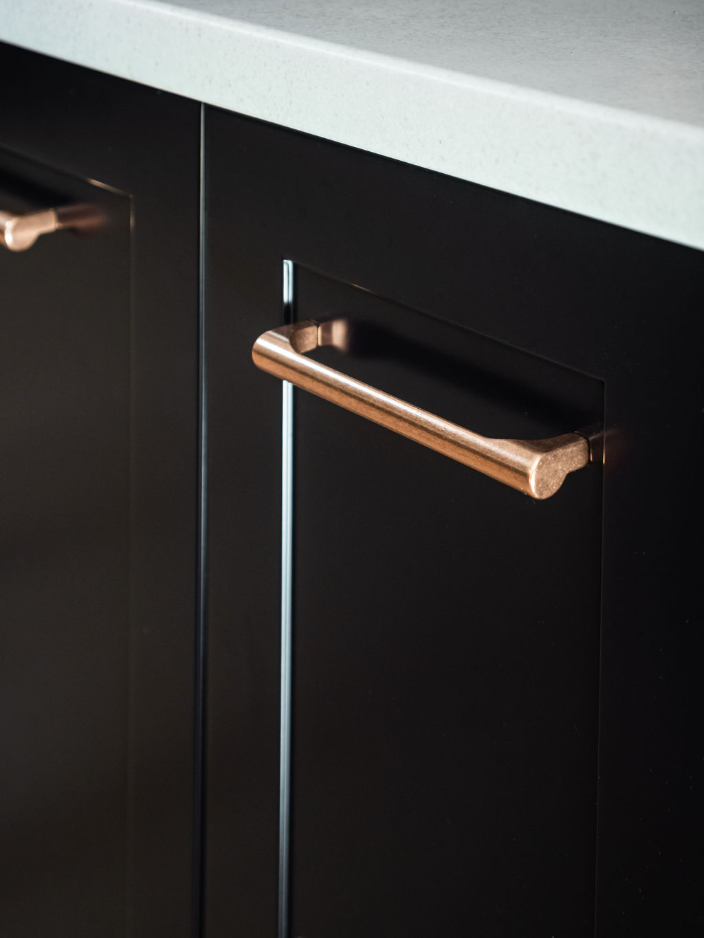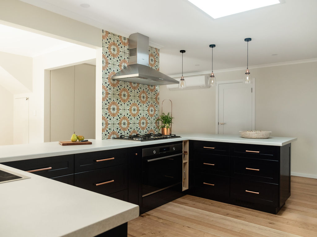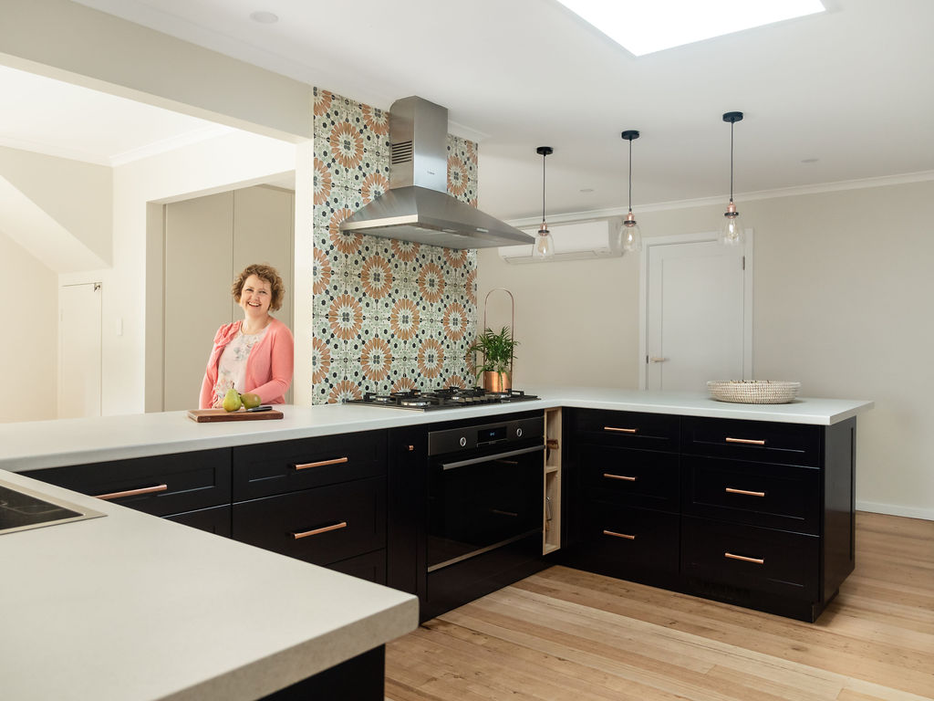 My clients were about to embark on a major renovation involving remodelling of their kitchen / dining space as well as a bathroom and laundry makeover. They had engaged a builder and selected Green Room Interiors to help come up with a co ordinated selection of materials & finishes. Top of the wish list was to inject some colour and personality into their spaces, rather than going with an all white kitchen. So we designed the kitchen colour scheme around my client’s treasured antique copper pot and vessel collection, incorporating a navy blue 2 pack kitchen with some display shelves for her collection.