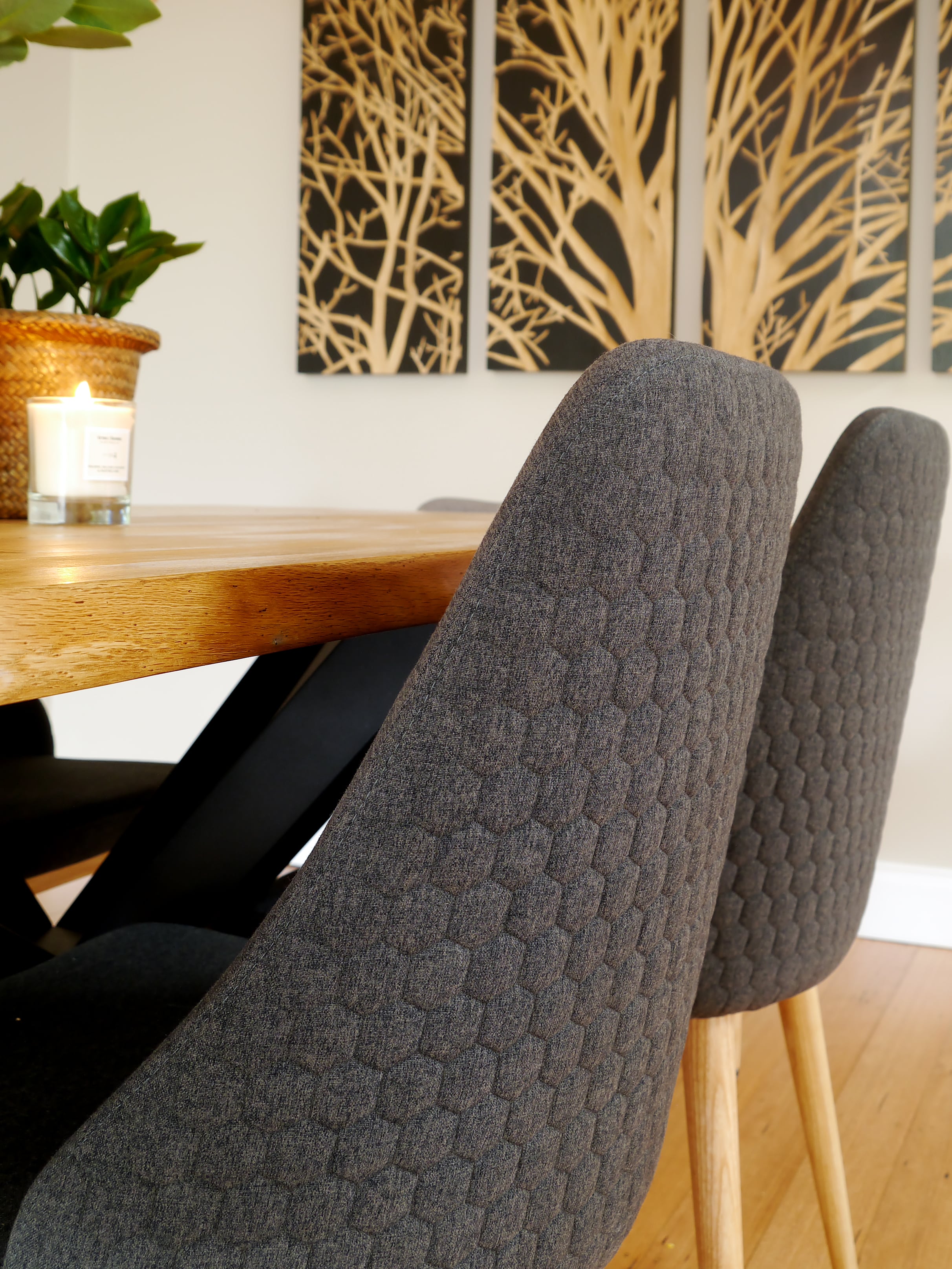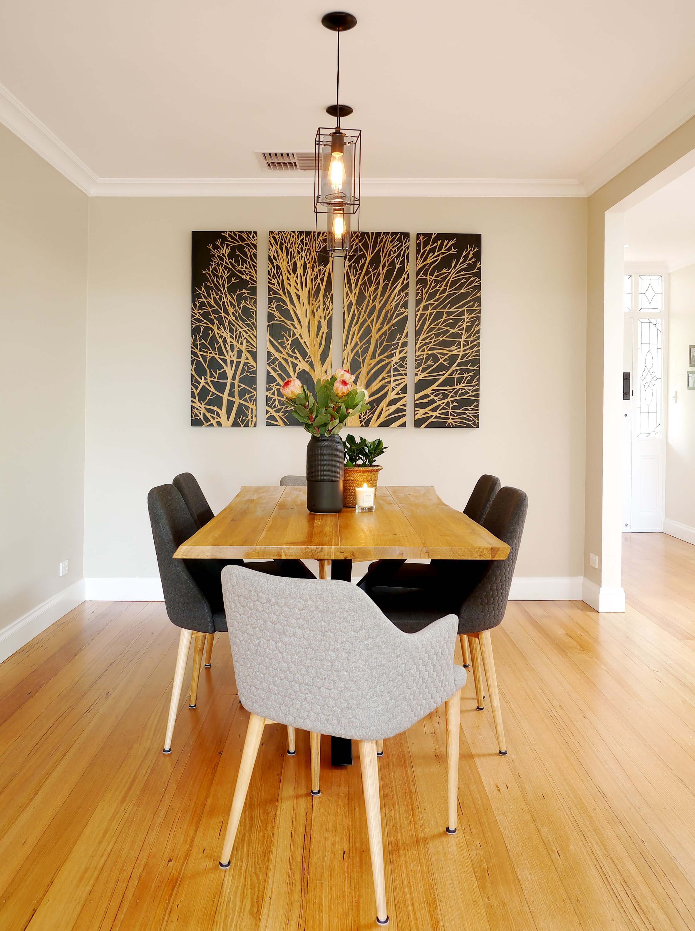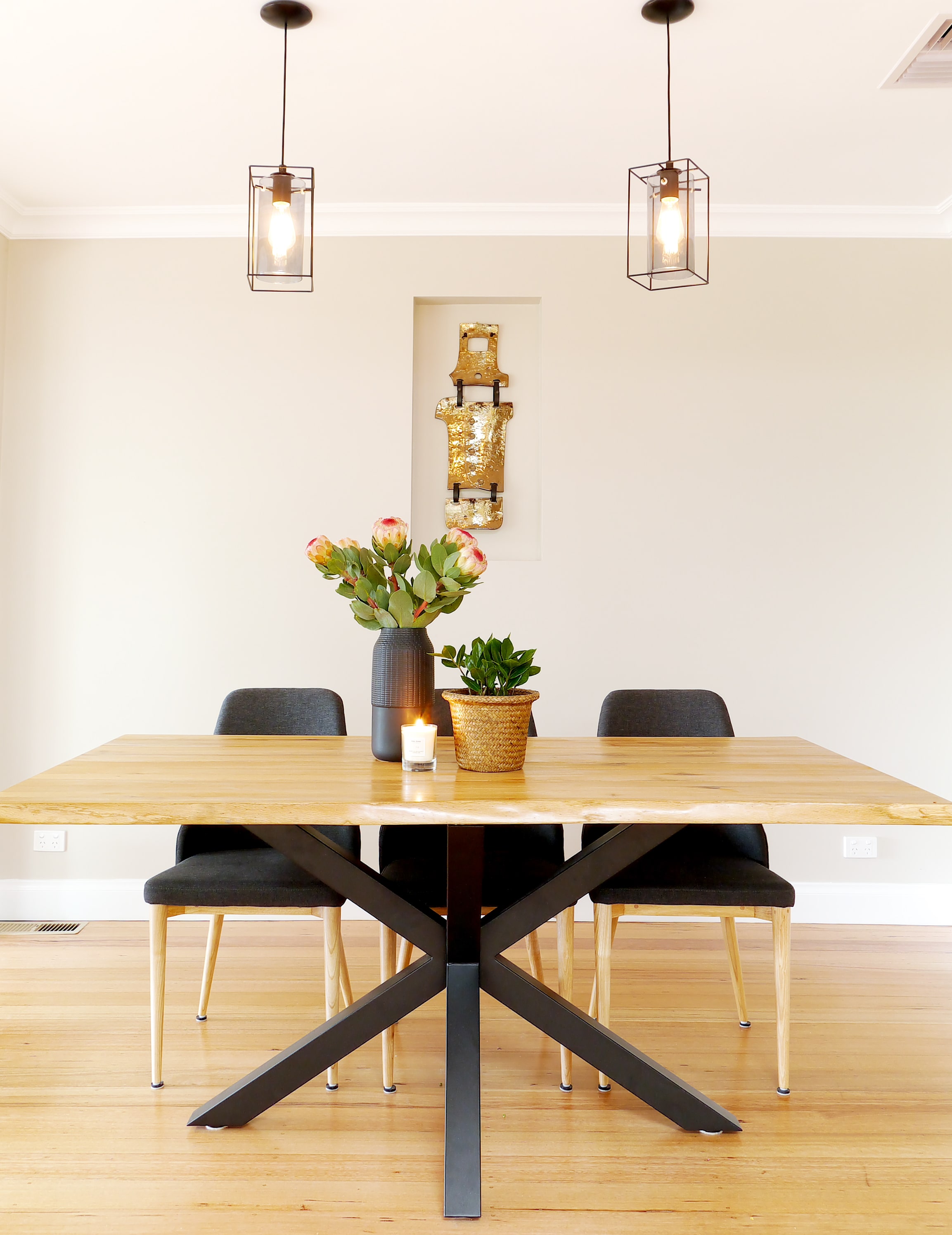 Finishing off the formal dining room with a smart dining table and comfortable chairs to enhance their prized sculpture of the Ned Kelly armour, placed in an especially designed niche.
