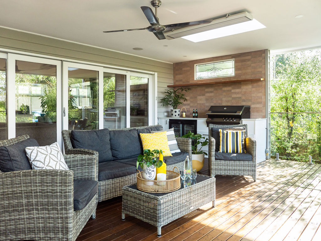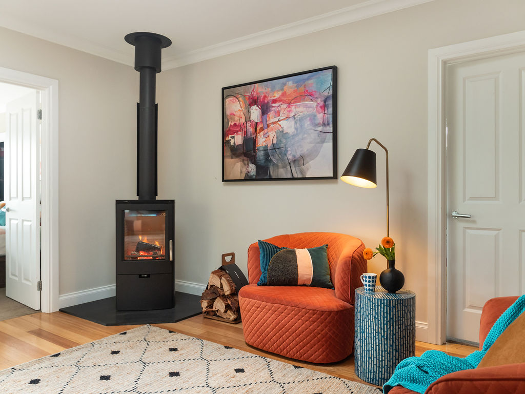 In the sitting room, which overlooks the alfresco area and also serves as a thoroughfare to two bedrooms, we integrated a freestanding fireplace and carefully planned the furniture layout to create a functional and welcoming space.