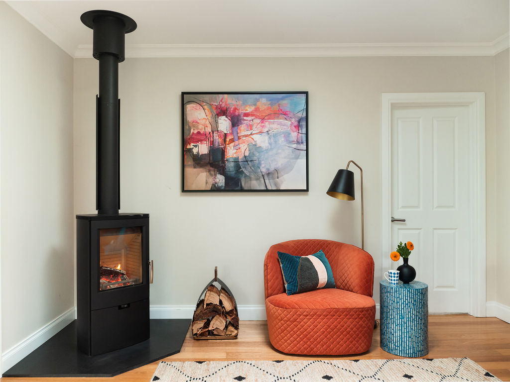 I selected furniture, cushions, rug, side table and lighting to complement the fireplace and enhance the room’s flow. The entire scheme was built around the striking artwork I had chosen for the room during our previous project, ensuring continuity and a personal touch.