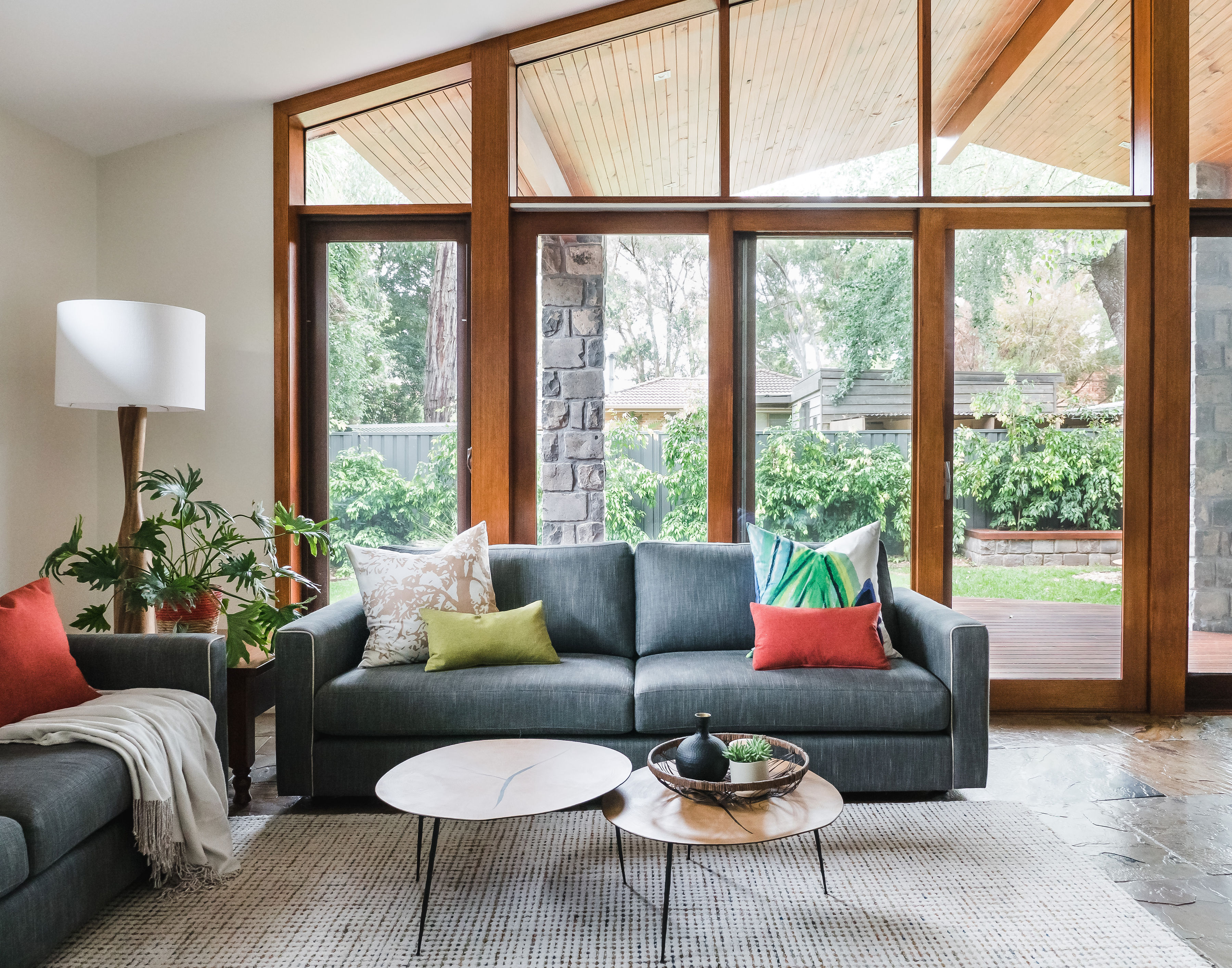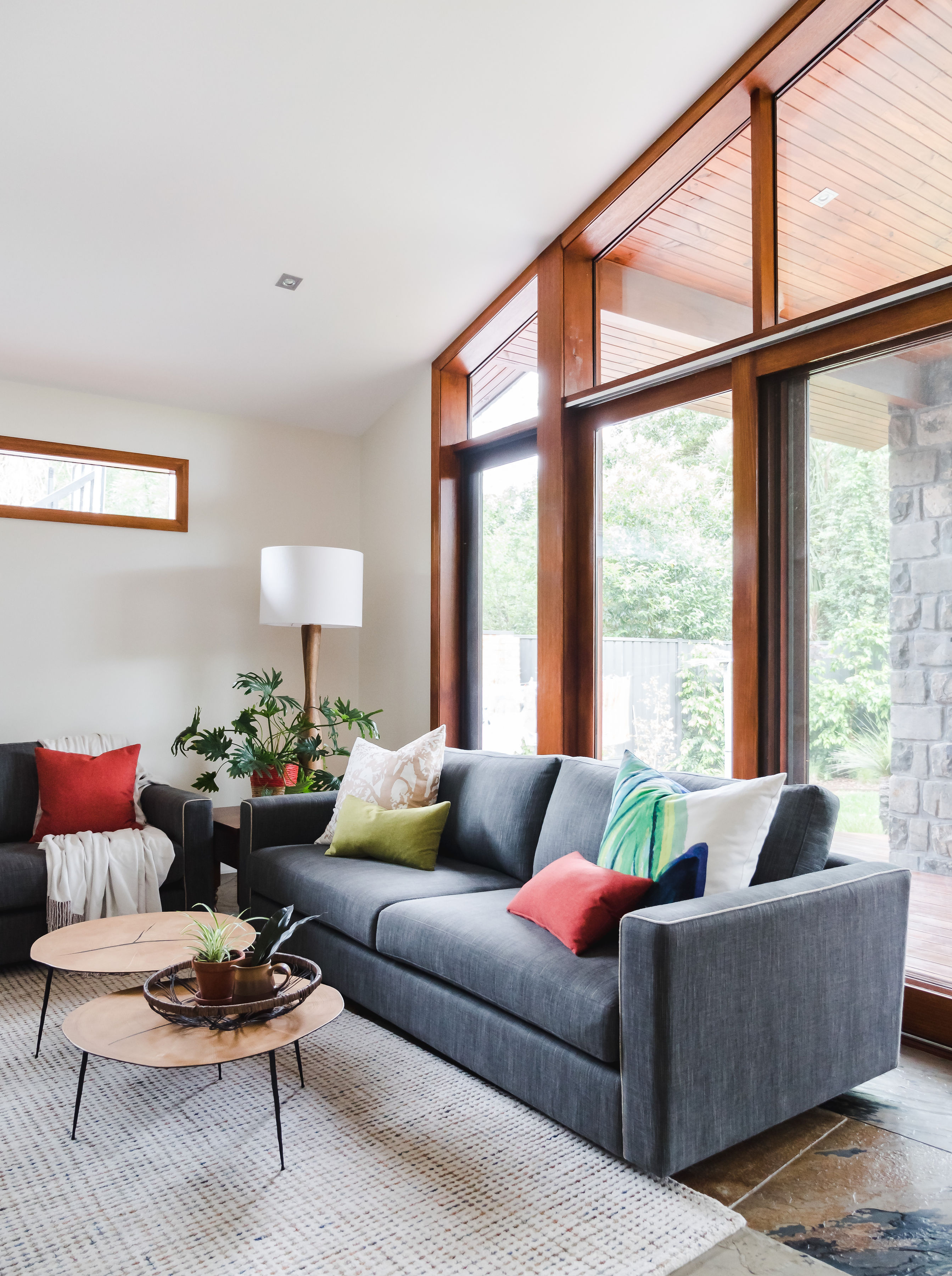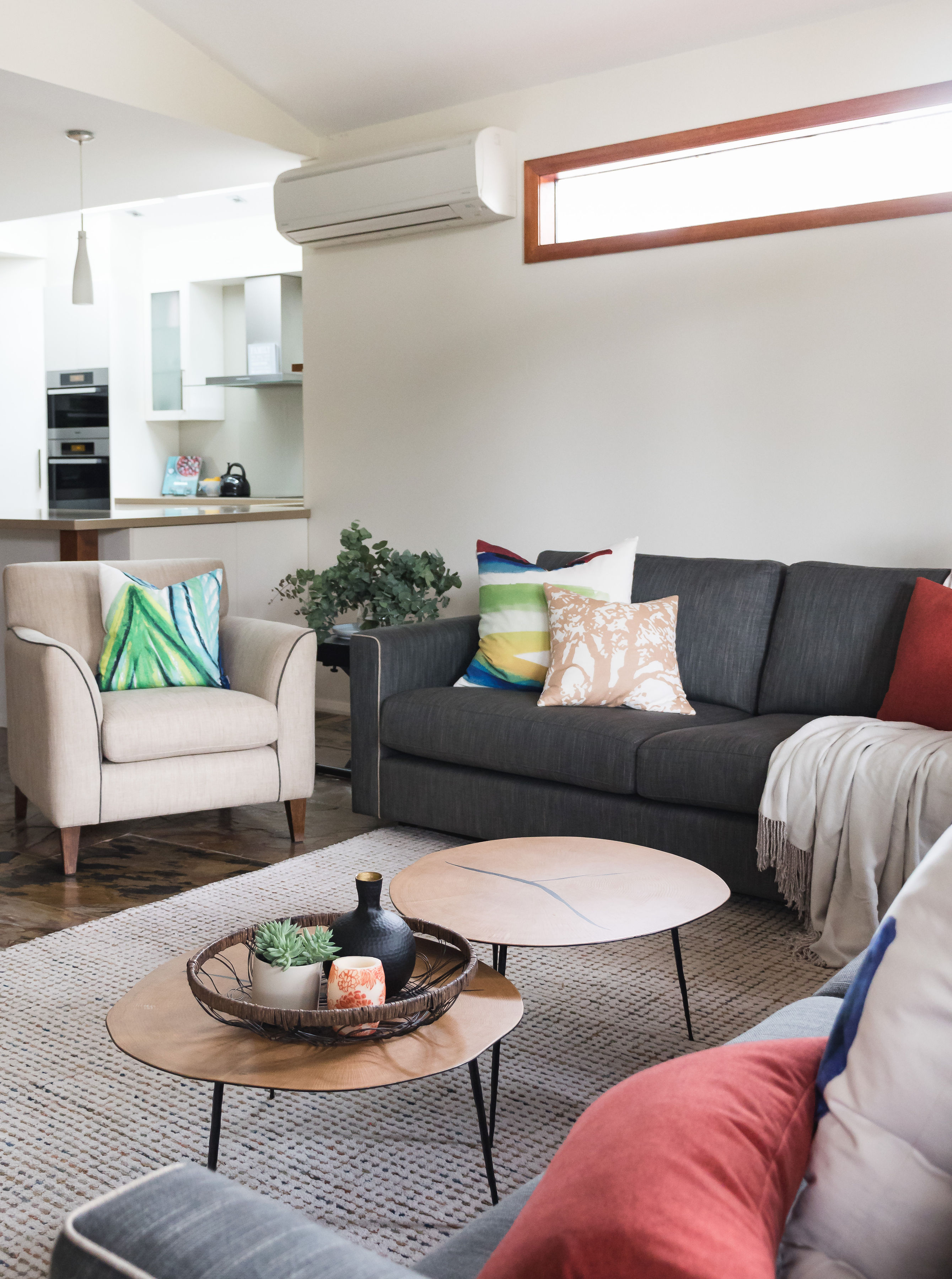 It was an open and cold space with slate floors and cathedral ceiling with beautiful timber windows. I had custom sofas manufactured in Melbourne, which were carefully tested by my clients to accommodate their family of five. Custom cushions and artwork was then selected to enhance the interior. Additional seating in the form of a custom ottoman was added to give more flexible seating options