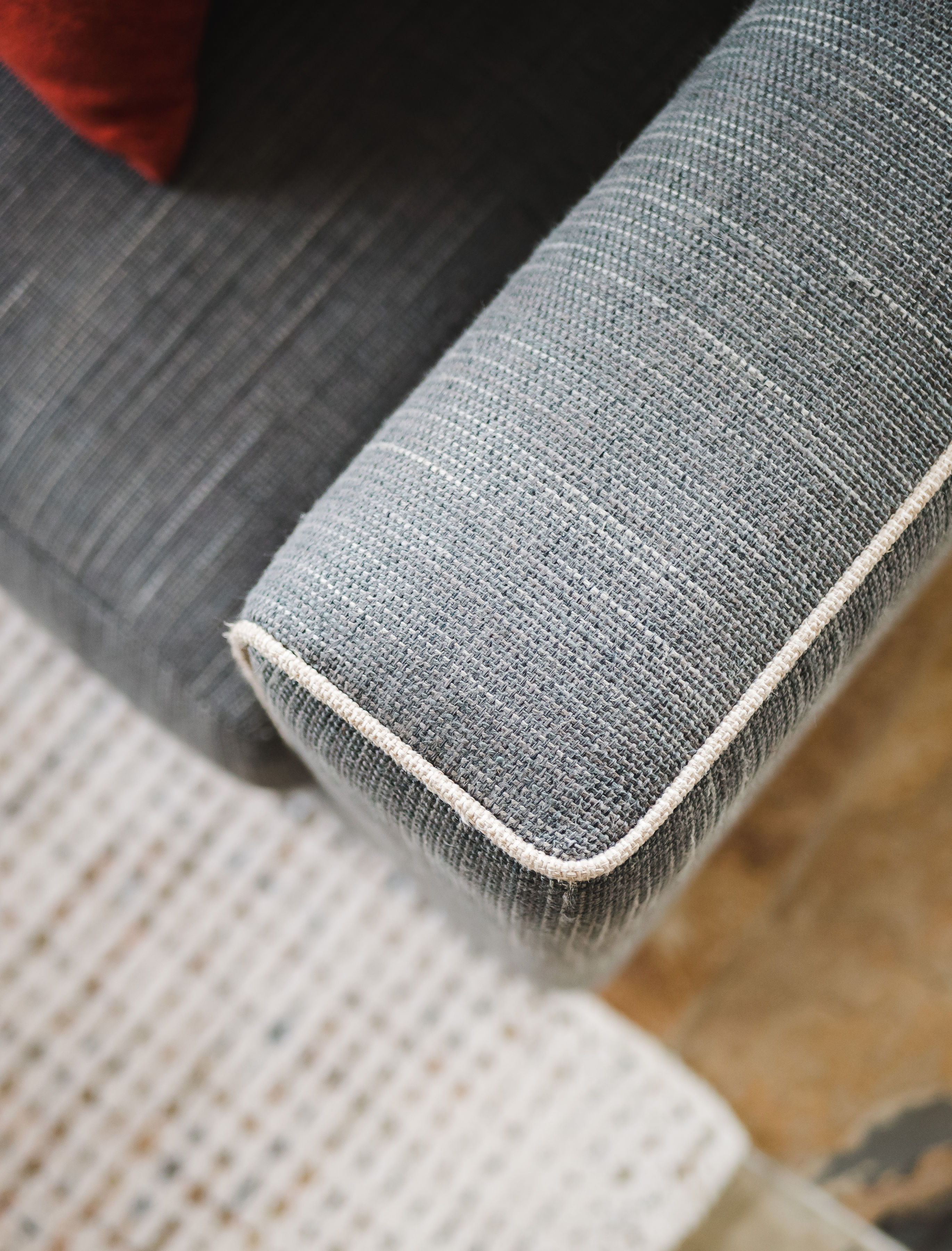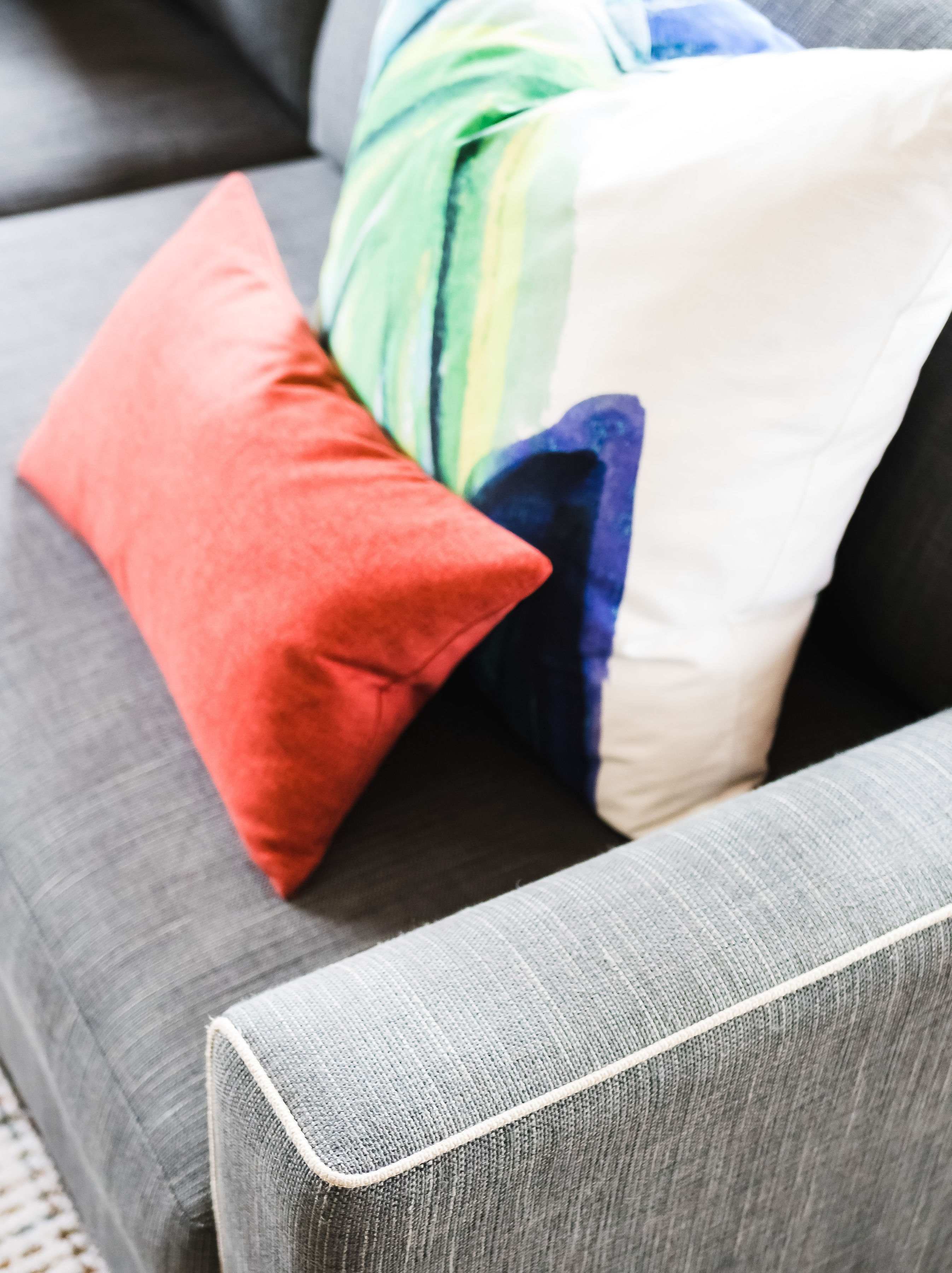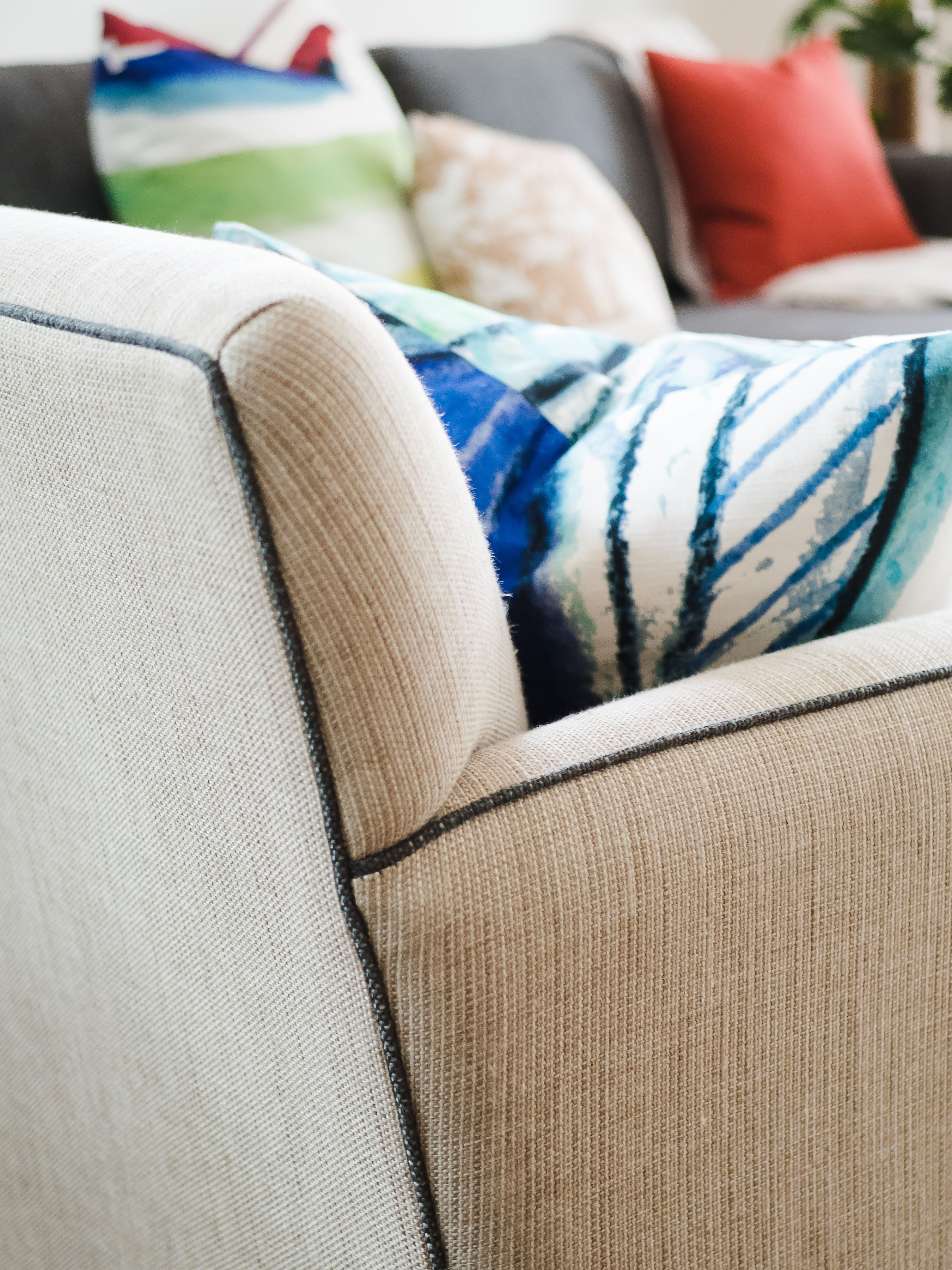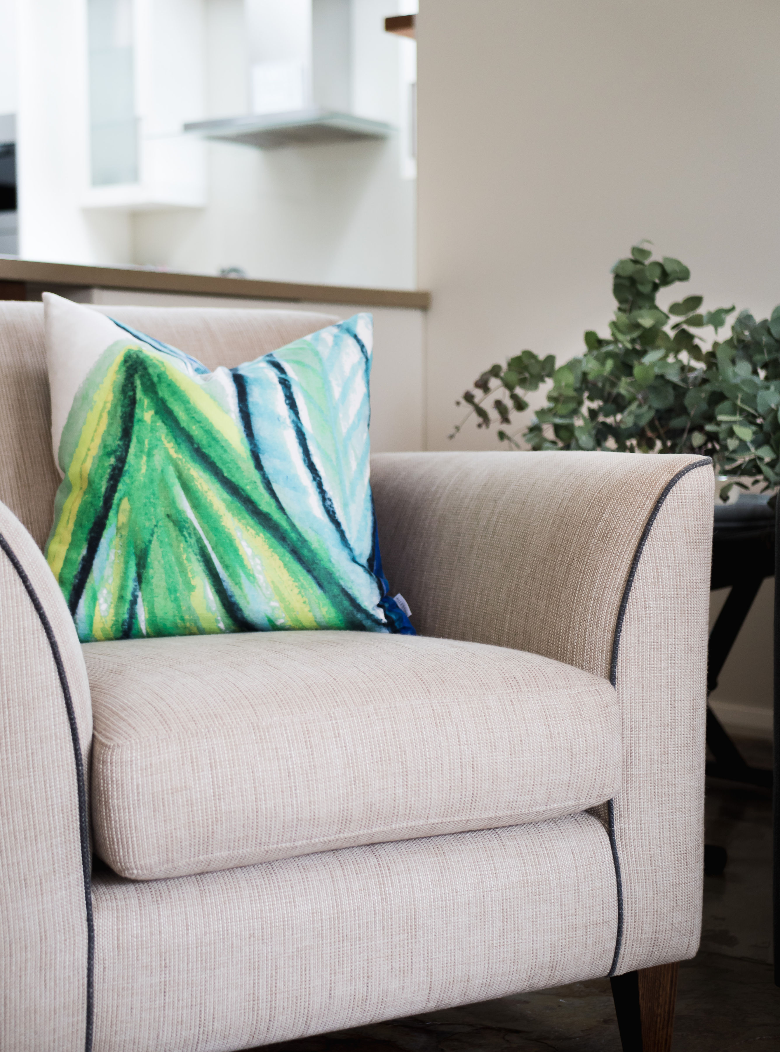 It was an open and cold space with slate floors and cathedral ceiling with beautiful timber windows. I had custom sofas manufactured in Melbourne, which were carefully tested by my clients to accommodate their family of five. Custom cushions and artwork was then selected to enhance the interior. Additional seating in the form of a custom ottoman was added to give more flexible seating options