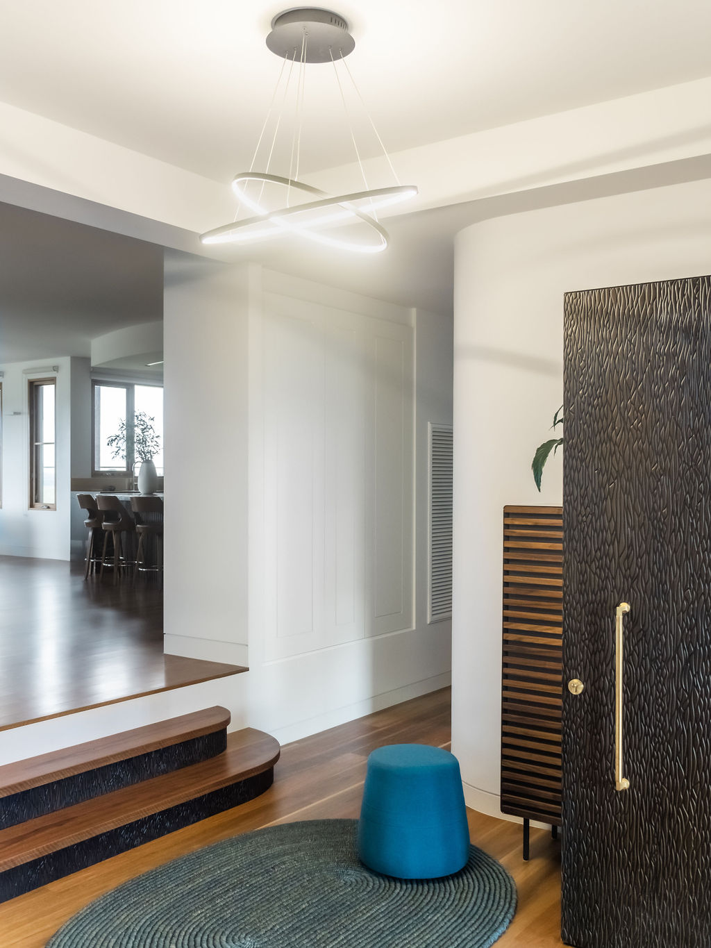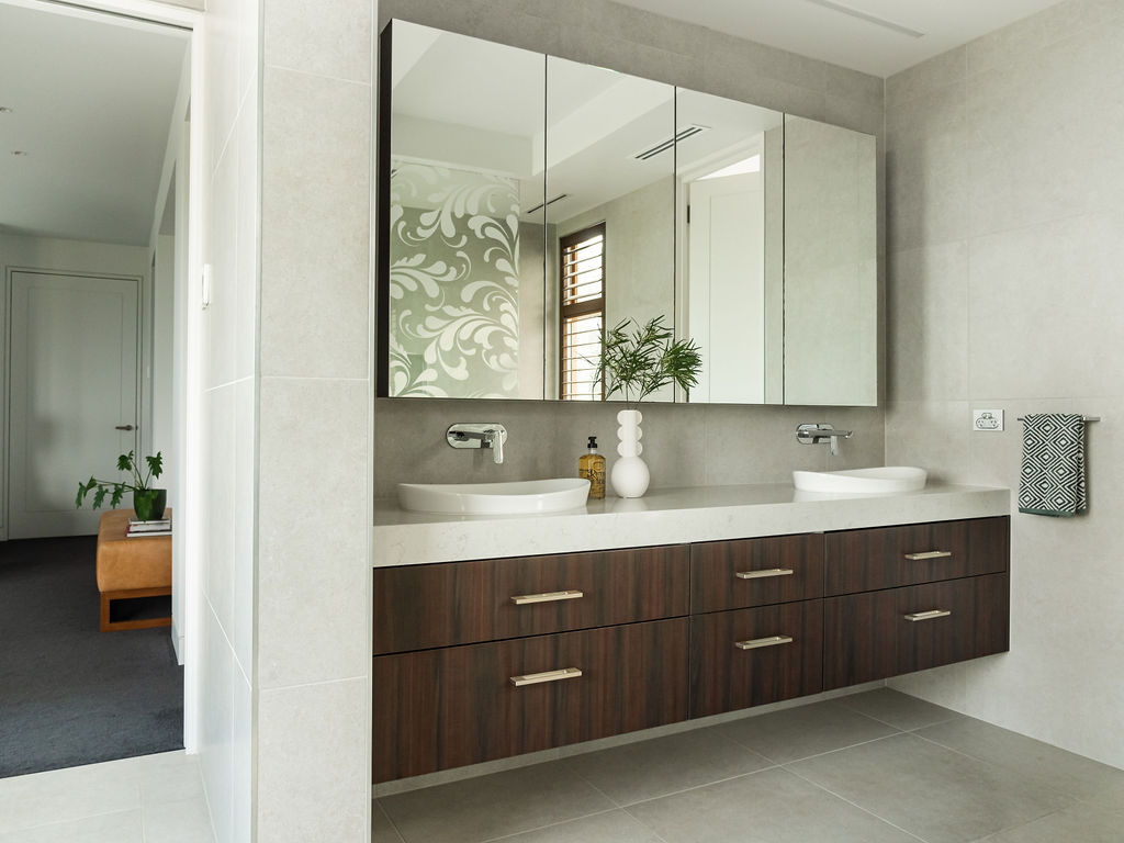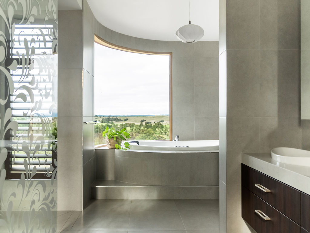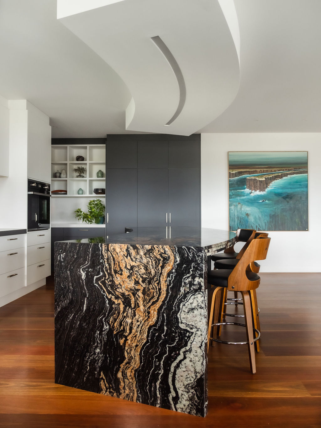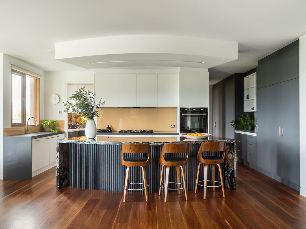 The biggest challenge for the builder, Mitch Stevens of Hi Style Building Group, was all the curved glass windows and walls in the home. This actually inspired a lot of the interior fit out, including the magnificent curved kitchen island bench!